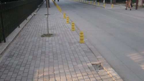 Дел од бетонските столпчиња кои се поставени по должината на тротоа...