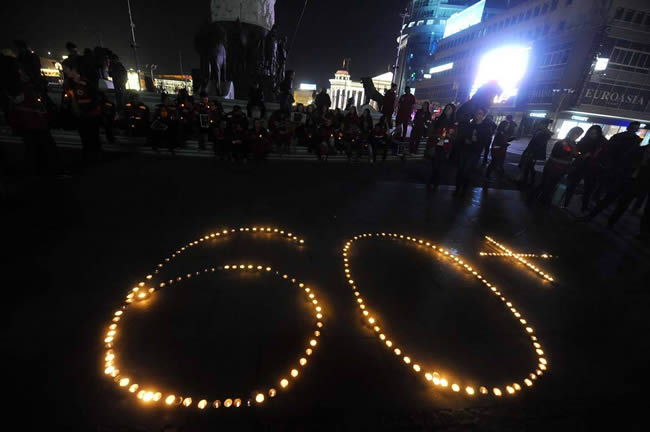 И плоштадот „Македонија“ во Скопје потоа во мракот во точно 20:30 часот, а потоа со запалени свеќи се формираше бројот 60+ што означува 60-минутно штедење на енергетските ресурси и заштита од климатските промени.