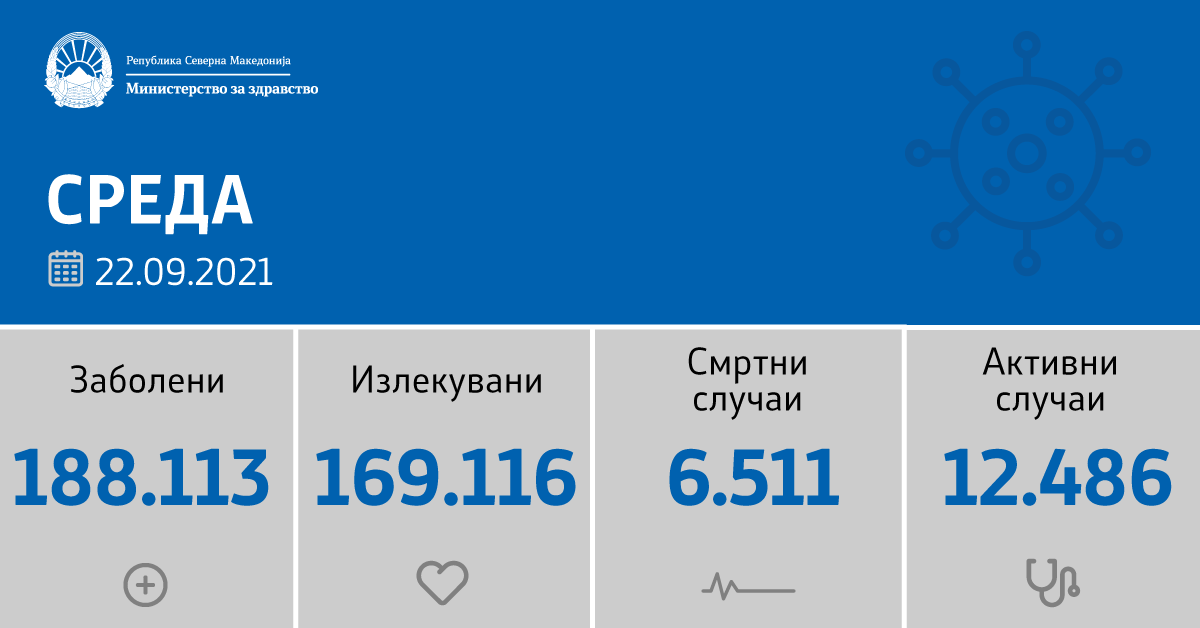 Дополнително, согласно Регистерот на умрени лица со дијагноза КОВИД-19 од Мој Термин, пријавени се уште 6 лица, со датум на смрт во период од 14.09.2021 до 20.09.2021 година. Овие починати лица се: по 2 од Скопје и Штип и по едно починато лице од Струга и Кичево. Починатите се на возраст од 54-83 години, од кои 3 лица починале во болнички услови, додека 3 лица се починати во домашни услови.