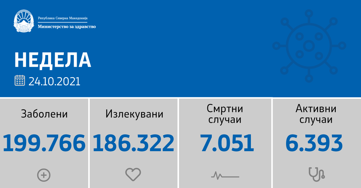 Вкупната бројка на Ковид-дијагностицирани лица во нашата земја од почетокот на епидемијата изнесува 199 766, бројот на оздравени пациенти е 186 322, починати 7 051, а бројот на активни случаи изнесува 6.393.