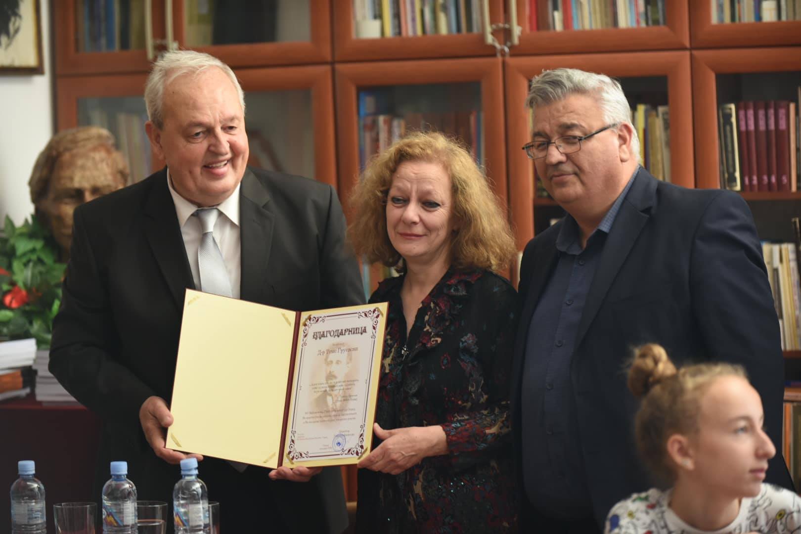 Груевски на директорката на Библиотеката Змејкоска, и ги врачи двете цедиња со снимени документи за животот и делото на Шахов, додека таа му врачи сертификат за почесен член на Библиотеката.