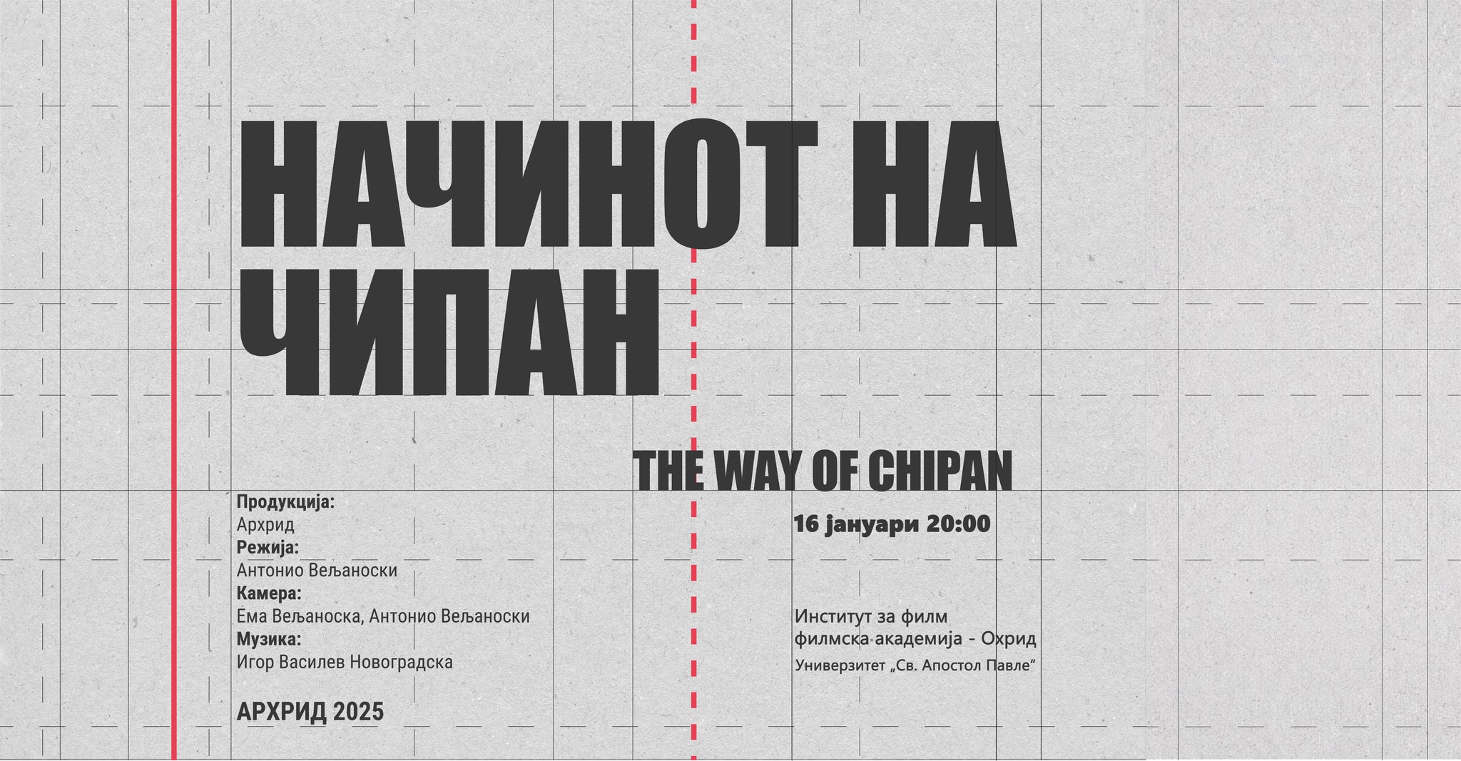 Во петок, 16 јануари, со почеток во 20:00 часот, во големиот амфитеатар на Универзитетот за информатички технологии „Св. Апостол Павле“ во Охрид, ќе биде прикажан филмот „Начинот на Чипан“, дело на режисерот Антонио Вељаноски.