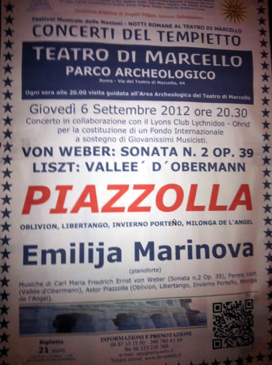 На концертот настапи познатата музичка уметничка од Охрид Емилија Маринова, инаку член на ЛК „Лихнидос“. Таа одржа концерт на отворена сцена во непосредна близина на античкиот театар во Рим.