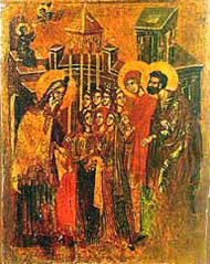 Во свечената поворка што три дена патувала од Назарет до Ерусалим најнапред оделе девојчиња променети во бела облека, со запалени свеќи во рацете, по нив Јоаким и Ана ја воделе малата Марија, а по нив оделе многу роднини и пријатели. Пред храмот свечената поворка ја пречекале свештеници на чело со првосвештеникот Захарие пеејќи црковни песни. Во храмот се влегувало по скали со 15 степеници. Родителите ја оставиле Марија на почетокот на скалите и таа самата се искачила со сила и сигурност на многу поголема возраст. Таму ја пречекал првосвештеникот Захарие кој на општо изненадување на насобраниот народ, а по божја повелба ја внесол во местото „Свјатаја свјатих“, каде што никој не смеел да влезе, а и првосвештеникот влегувал само еднаш во годината и тоа на празникот на очистувањето. И ова е поврзано со идната улога на Богородица, мајката на Исус Христос. Потоа Јоаким и Ана принесле жртва, се простиле со Марија и се вратиле дома.