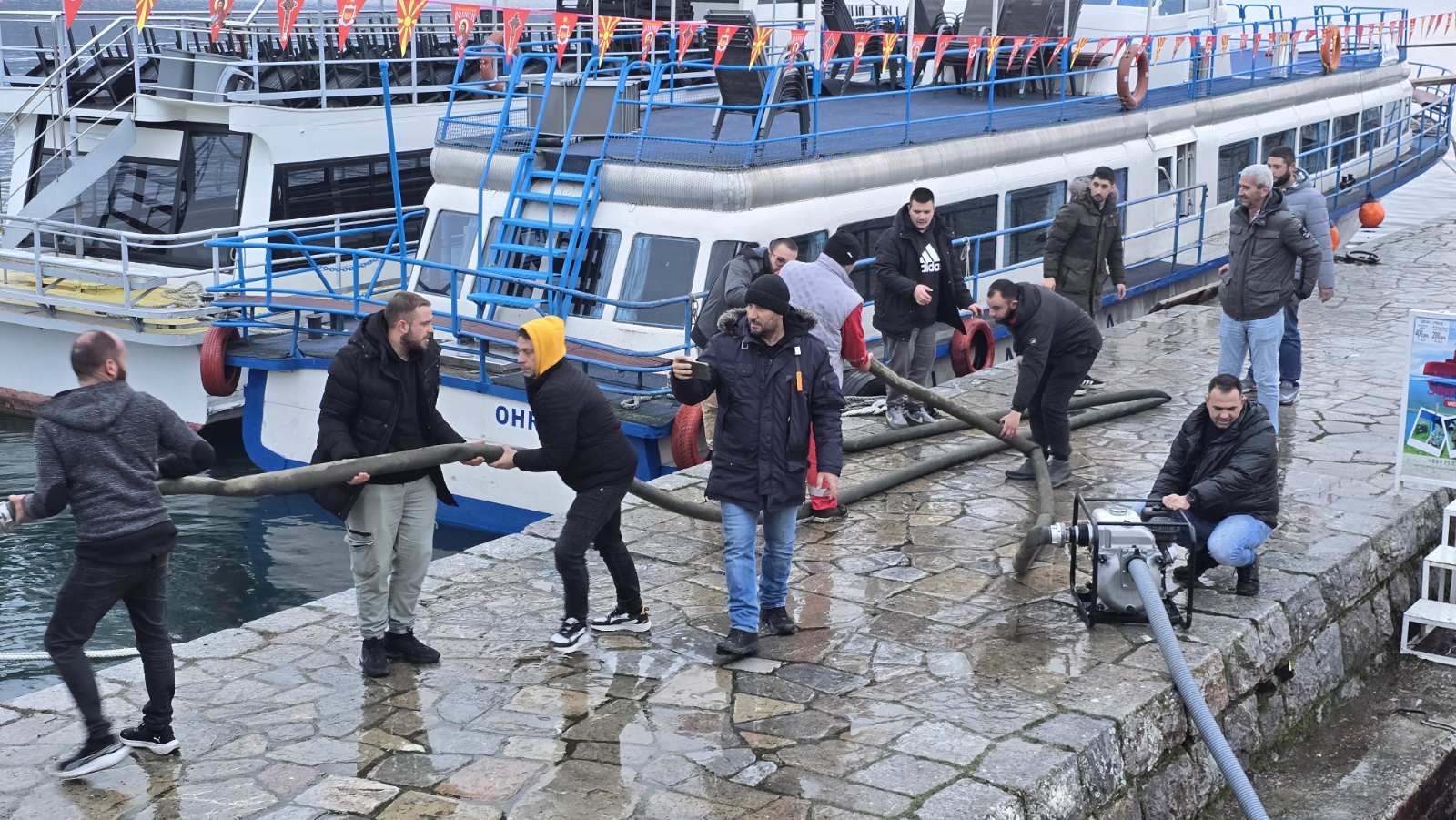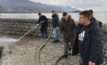 Во рамките на оперативните активности беше извршено темелно чистење и транспорт на кабаст отпад, цврсти материи и наталожен смет од крајбрежниот појас, чистење на јавната површина, односно комплетно машинско миење на пристаништето со цел отстранување на нечистотиите.