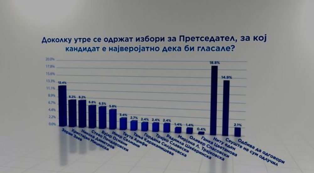 Претстојните претседателски избори ќе бидат длабоко вкопани во партиските ровови, со мали изгледи за консензуален кандидат, при што 12,4% од граѓаните за иден претседател би му дале доверба на актуелниот премиер Зоран Заев, а веднаш по него на лидерот на ВМРО-ДПМНЕ, Христијан Мицкоски и шефот на дипломатијата Никола Димитров со по 8,2% поддршка. Ова го покажа новата анкета на Телма и МЦМС спроведена од 7 до 14 декември на репрезентативен примерок од 1014 испитаници.