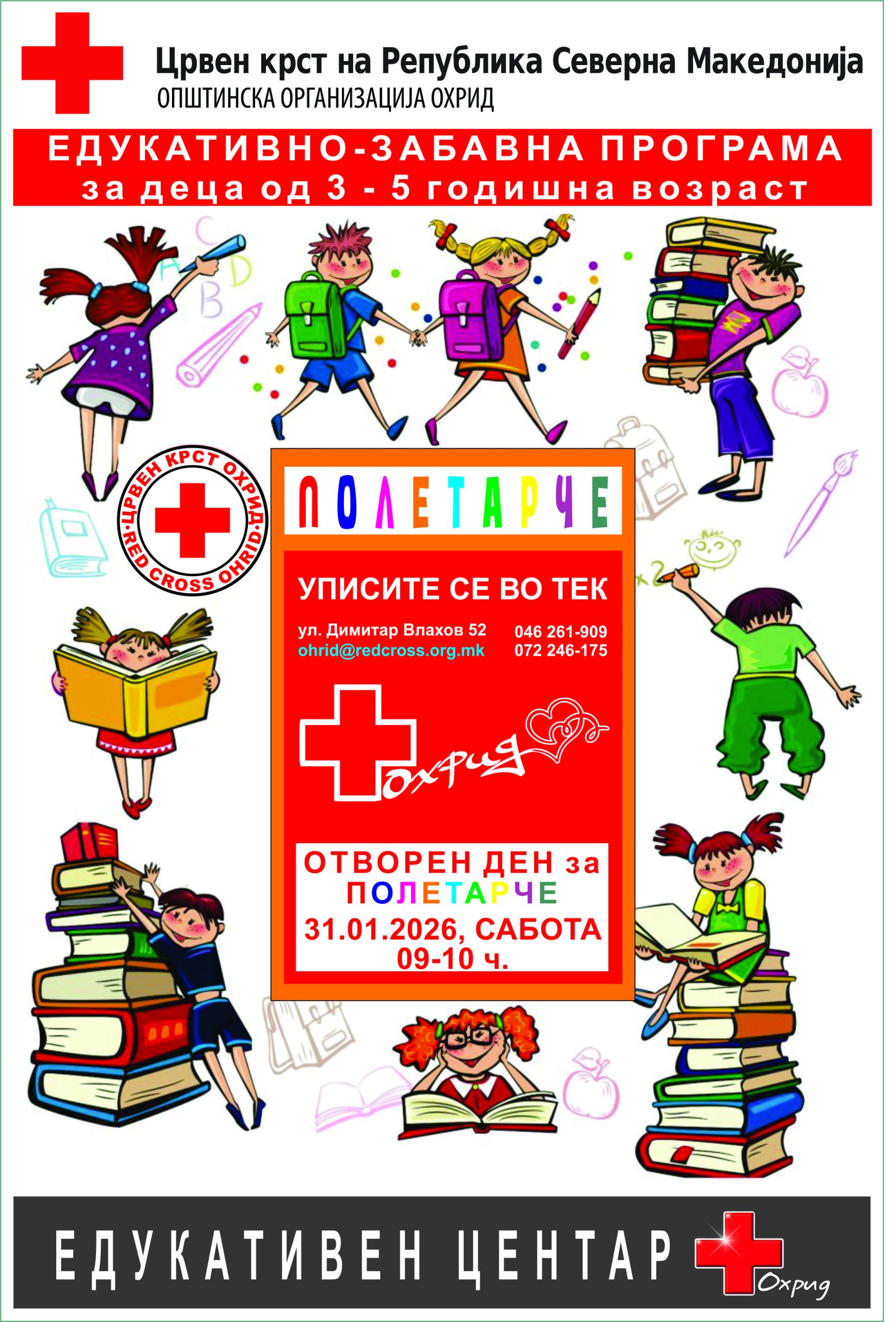 Црвен крст Охрид започнува со уписи за пролетниот циклус на програмата „ПОЛЕТАРЧЕ“ преку која деца на возраст од 3-5 години преку игра, забава и дружење ќе ја развиваат и јакнат самодовербата, ќе стекнуваат вештини важни за успешно извршување на училишните задачи преку креативни вежби за броење, помнење и концентрација, вежби за размислување, вежби на графомоторика, вежби на фина моторика, вежби за осознавање и разбирање на просторните и временските односи, вежби за говорот и речникот, јазична и математичка писменост, социо-емоционални вежби, вежби за насочување и одржување на вниманието и друго.