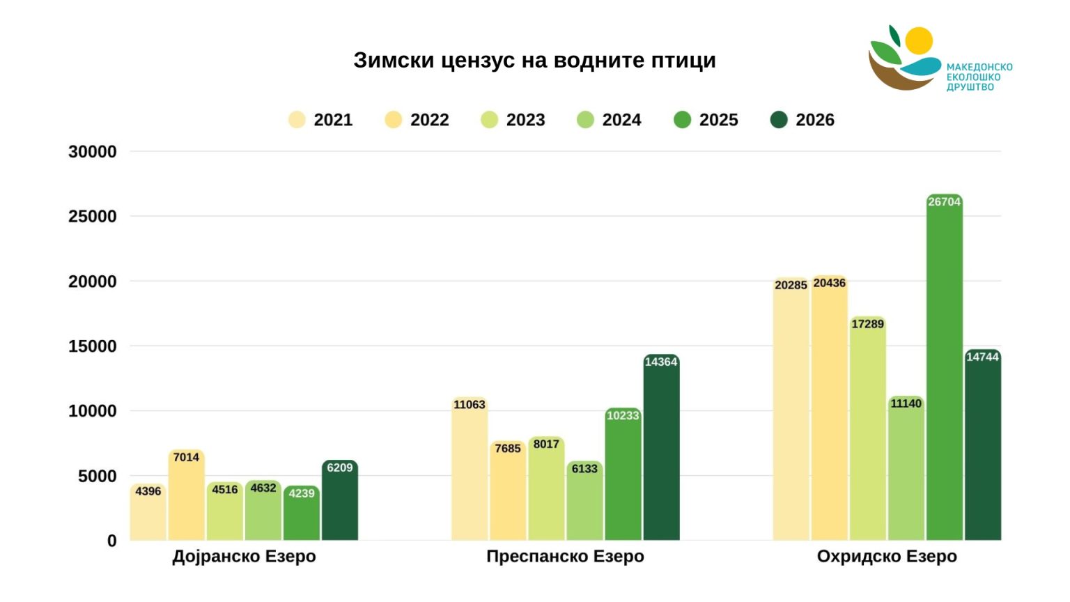 Над 35 300 единки од 44 различни видови на водни птици беа попишани за време на зимското пребројување на птици на трите природни езера во Македонија, што под водство на Македонското еколошко друштво (МЕД) кај нас се реализира секој јануари од 2010 година наваму како дел од Меѓународниот зимски цензус на водни птици.