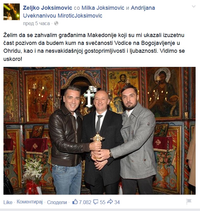 Жељко Јоксимовиќ преку својата фан страна на Facebook денеска им се заблагодари на сите Македонци за љубезноста и гостопримството што му ја искажаа за големиот христијански празник Богојавление – Водици.