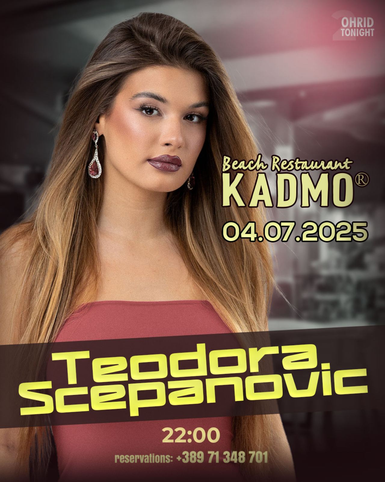 На 4 јули, петок, во плажа ресторан „Кадмо“ ќе настапи Теодора Шќепановиќ. Забавата почнува во 22 часот, местата се ограничени, затоа на време резервирајте си место и уживајте во забавата со прекрасен поглед на Охрид.